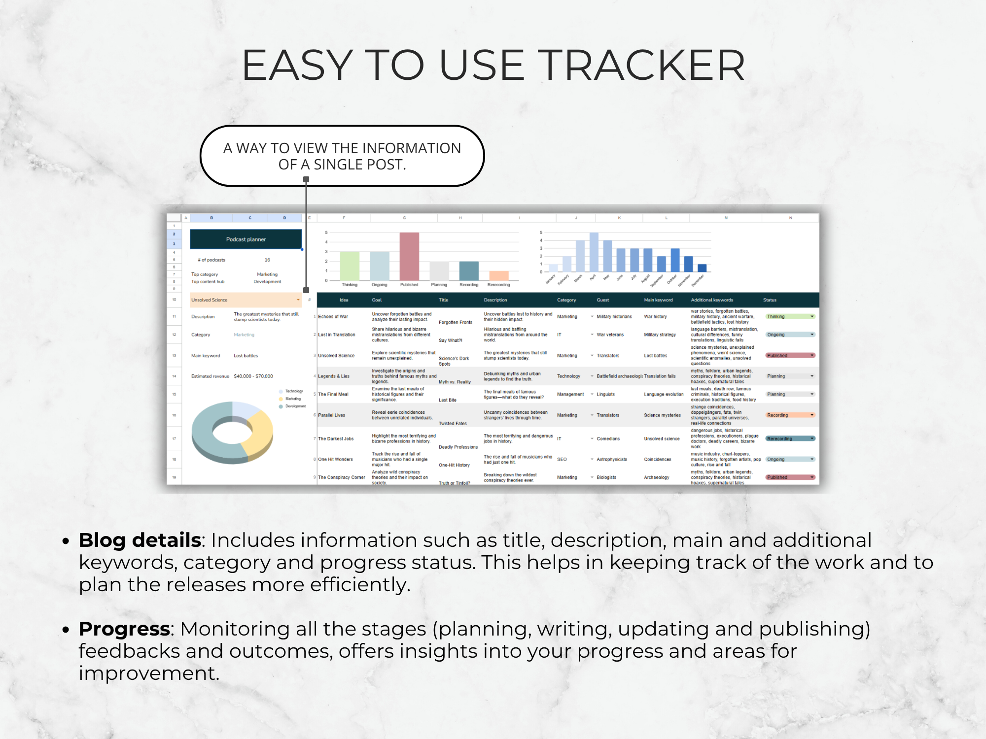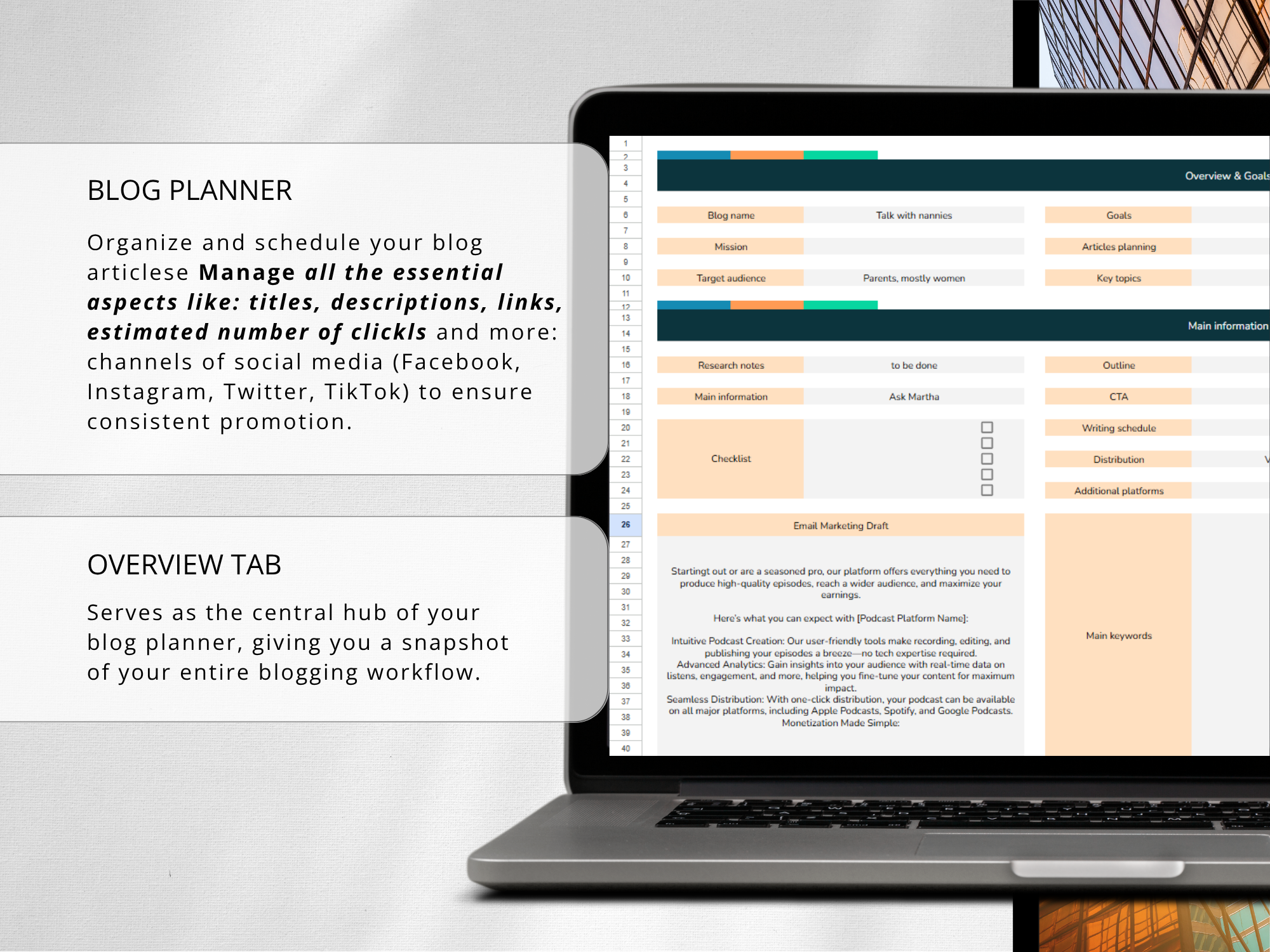 - Google Spreadsheets compatible: Easily organize, customize, and track your blog posts, deadlines, and ideas on any device using Google Spreadsheets.