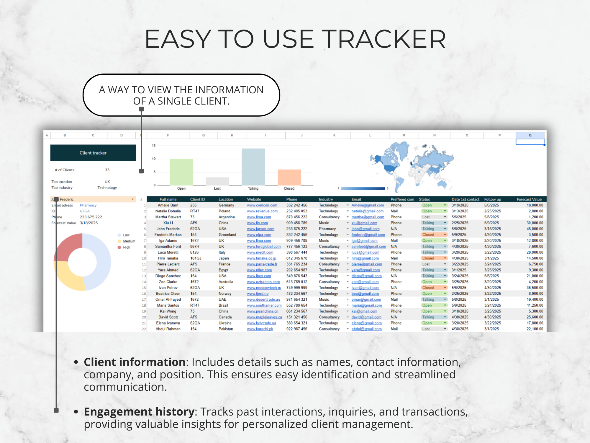 - Interactions tracking: dates of contact, notes and follow-up reminders;