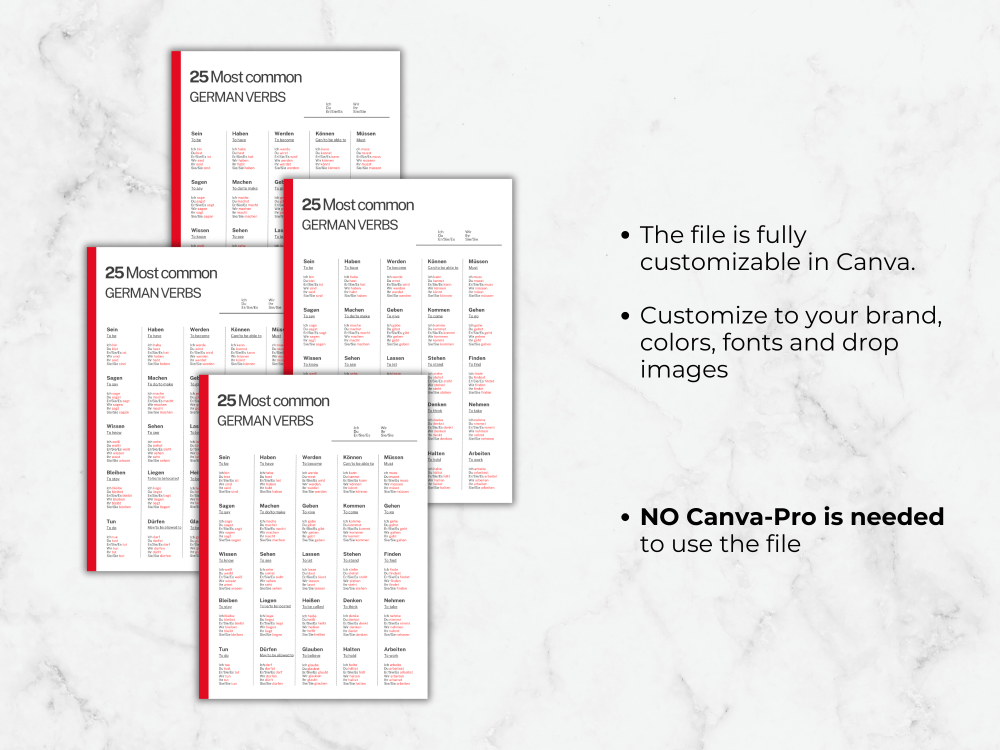 Your purchase of this produst is for your personal use only. Please note that your purchase does not include Resell or PLR (Private Label Rights). You are strictly prohibited from reselling, redistributing, or sharing the digital files and access links as your own work on any platform. By purchasing, you agree to use the German verbs conjugation Template exclusively for your own private advancement and not as a product to be redistributed, flipped, or sold as is.