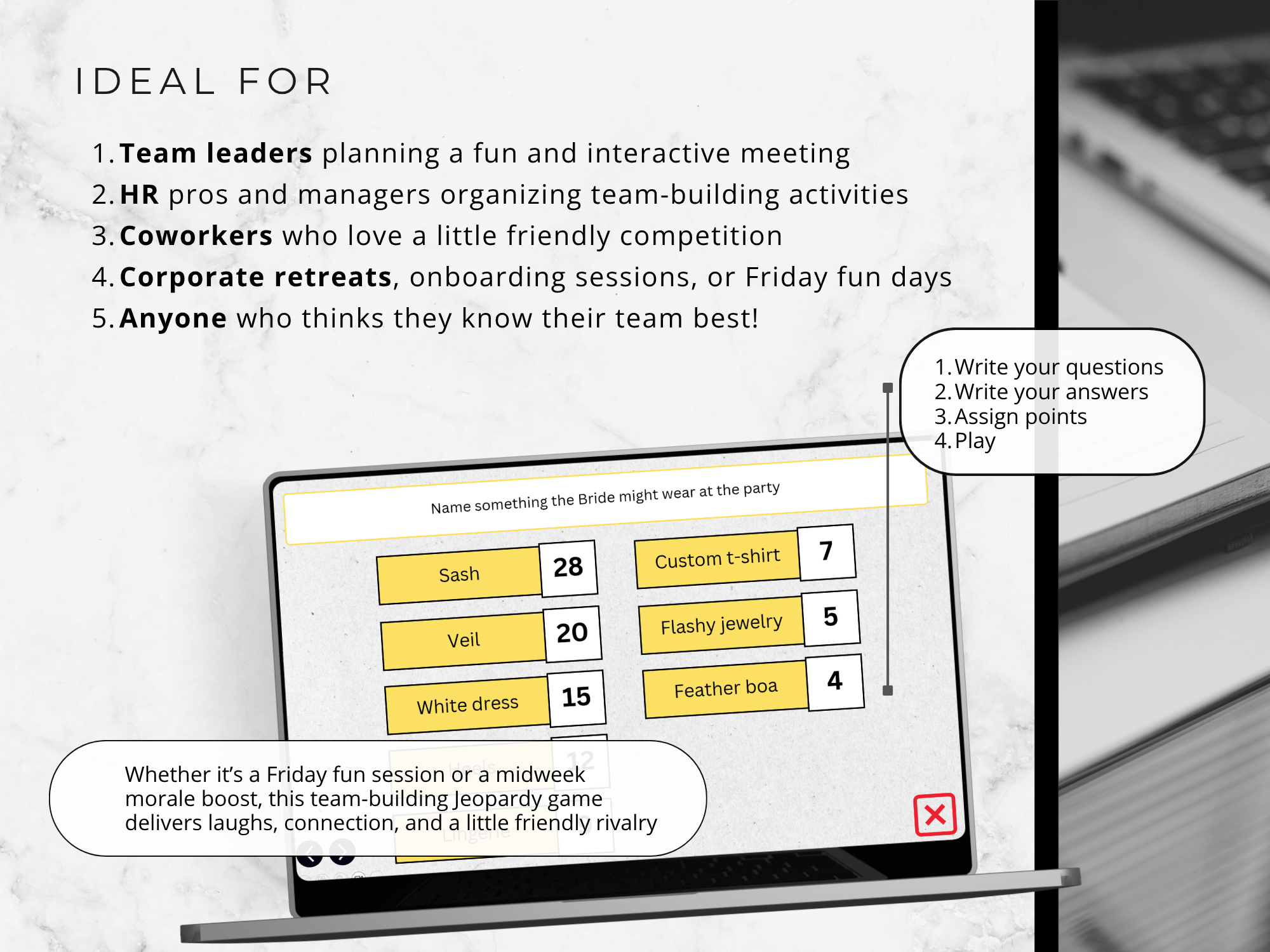 It helps you create an easy-to-run game that boosts morale, strengthens teamwork, and gets everyone involved, without extra prep time.
