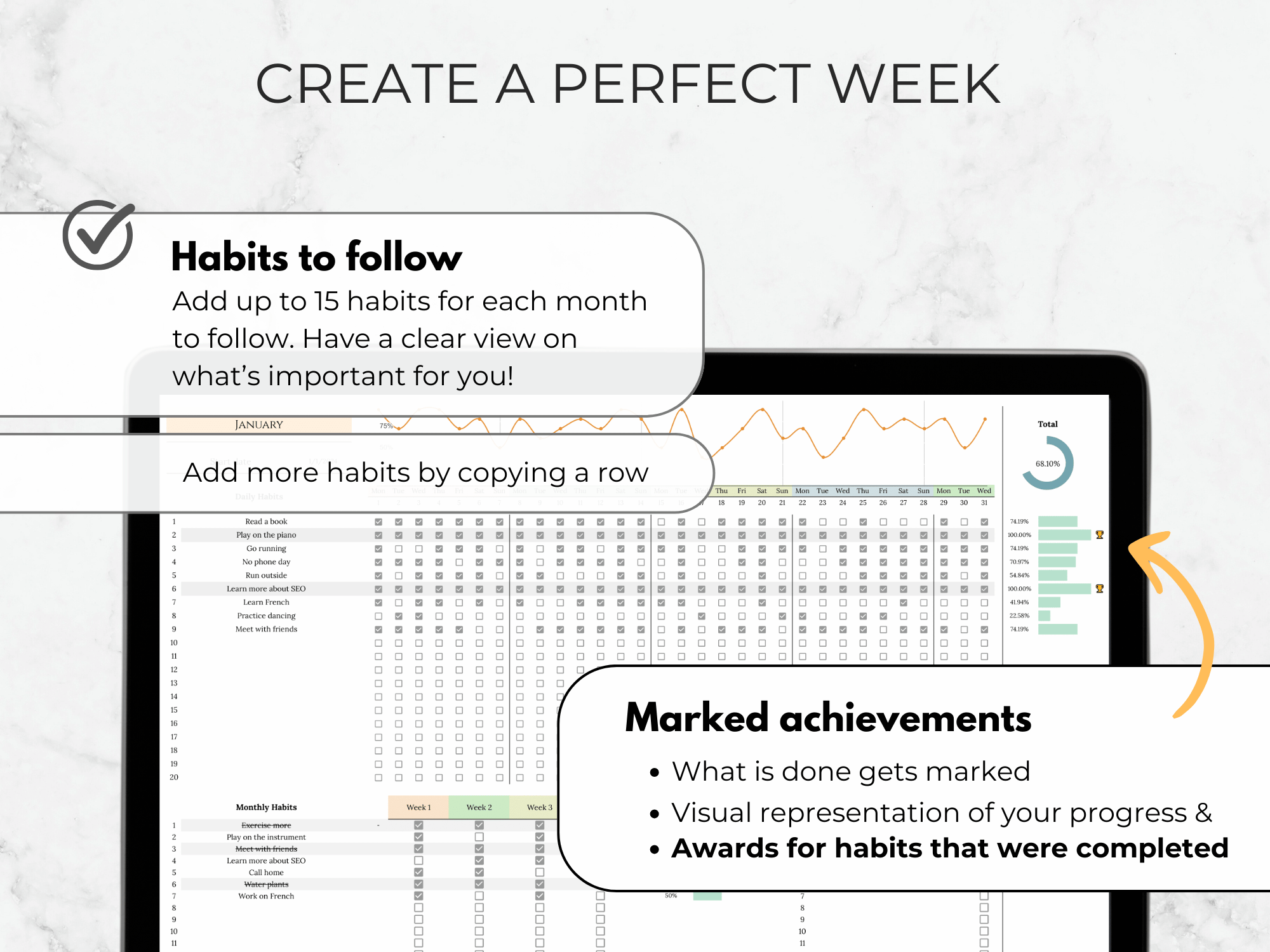 - Fully customizable layout for your goals, habits, and lifestyle routines.