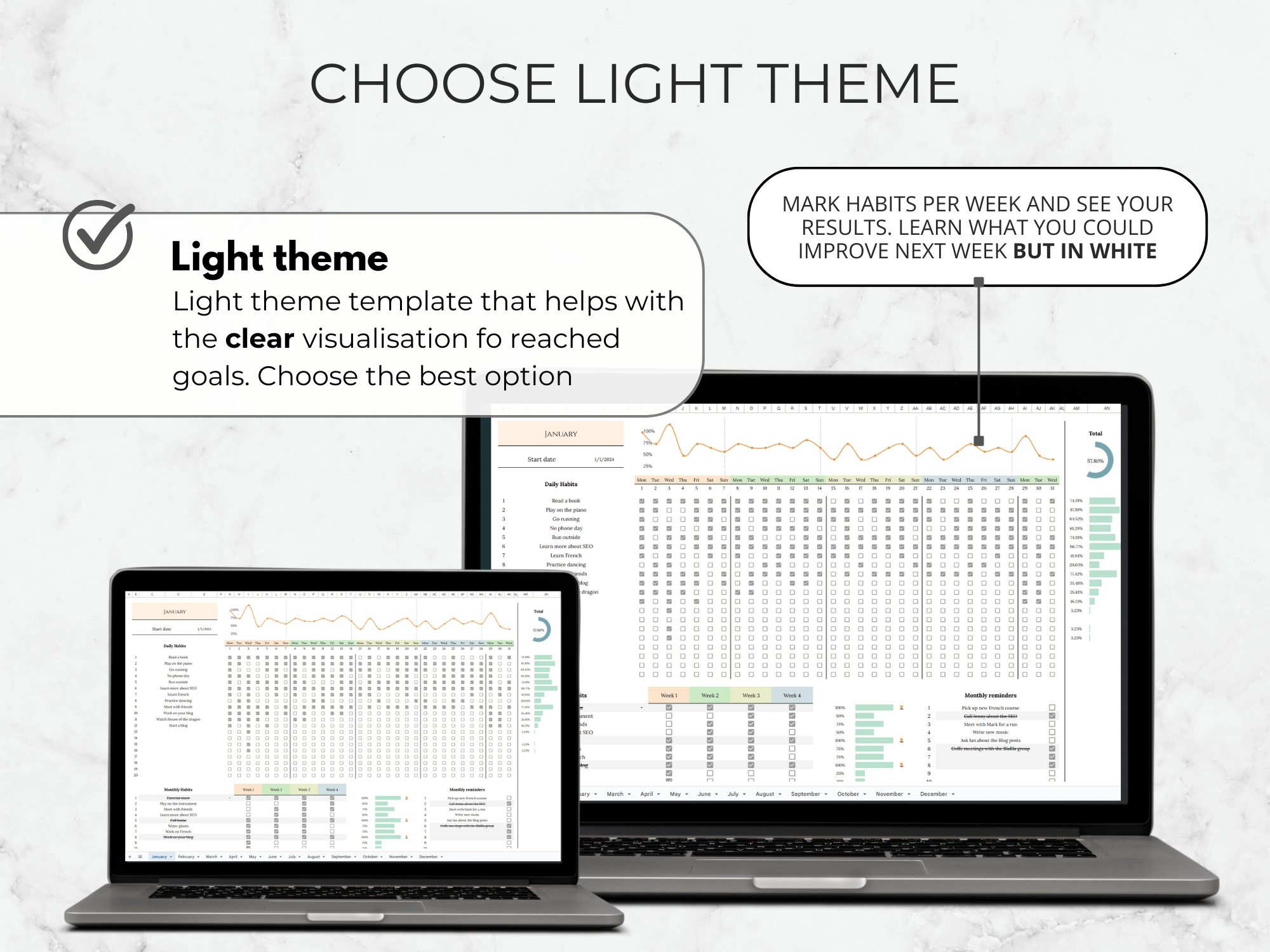- Google Sheets Habit Tracker Template (light, modern design), check out the dark version;