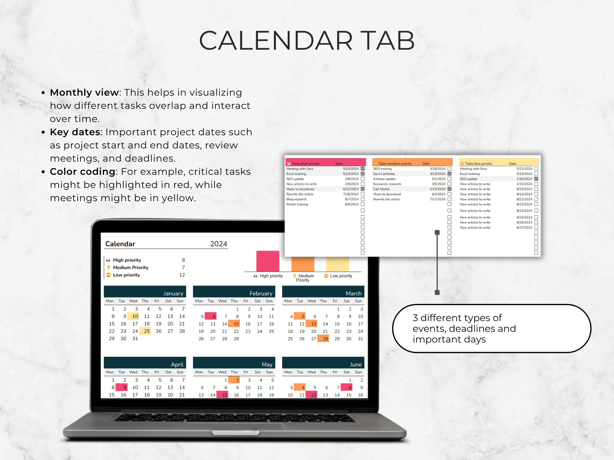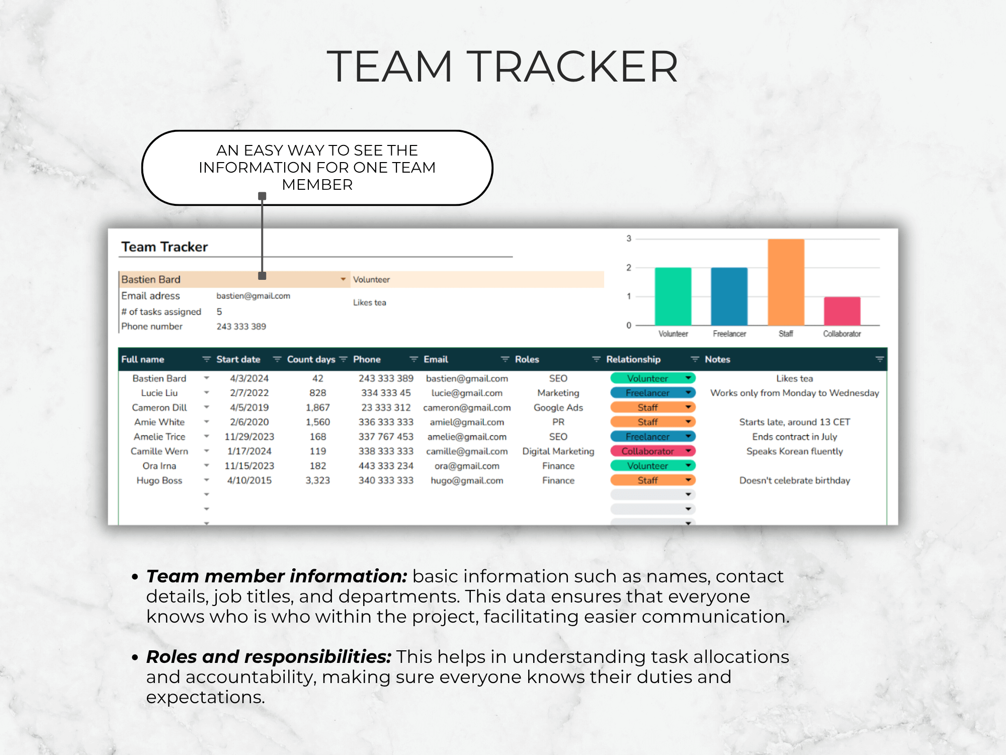 With your purchase, you receive a single Google Sheets template with multiple tabs designed to simplify project management: