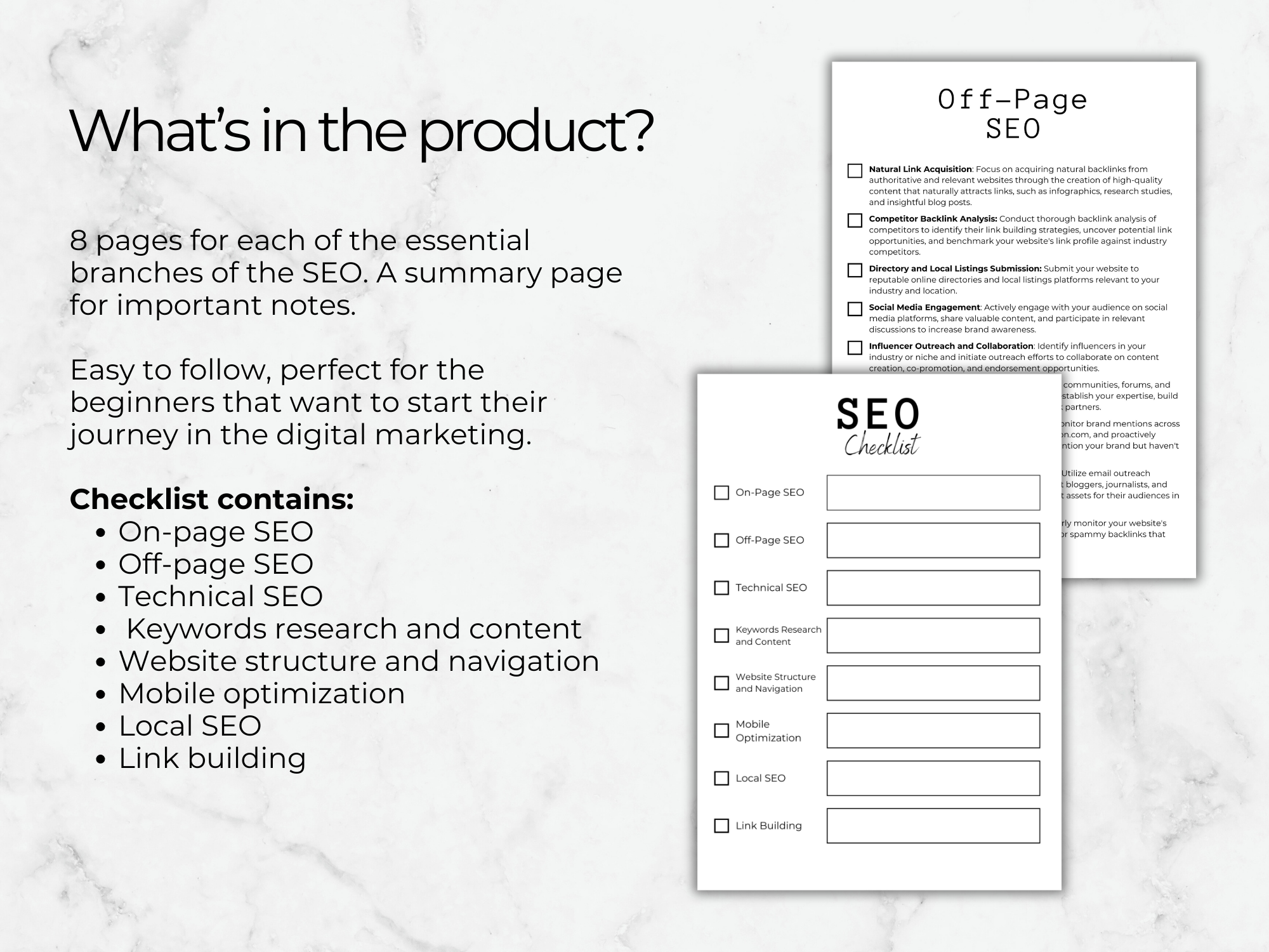 The checklist is perfect for both beginners and experienced users. It breaks down complex SEO tasks into clear, actionable steps, so you can start improving your website’s visibility right away.