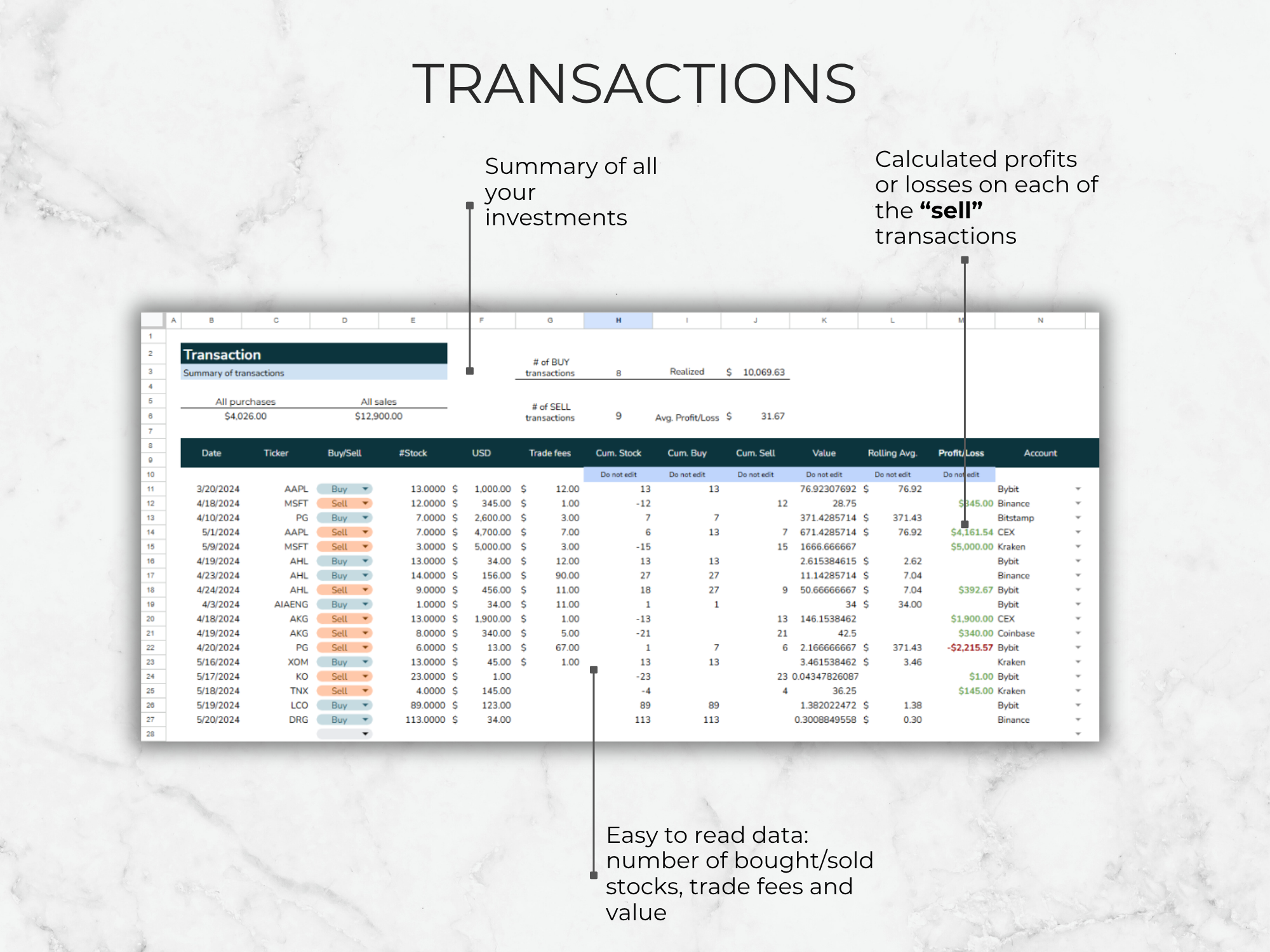 - Automatic calculations for ROI, profit and loss, and portfolio performance, with no setup or formulas needed.