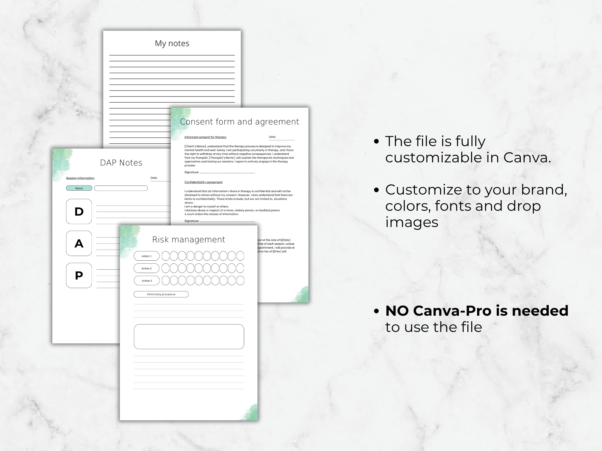 Editable PDF & Canva file (50 pages): Customize and adapt to your practice style;